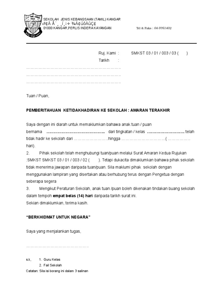 AMARAN KEDUA Saya dengan ini memaklumkan bahawa anak jagaan tuan TAY SIEW LEE di tingkatan 5D telah tidak hadir ke sekolah seperti tarikh-tarikh berikut. Contoh surat amaran tatatertib pekerja download kumpulan gambar. Kluang JOHOR Tuan Pemberitahuan Ketidakhadiran ke Sekolah.